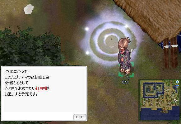 1、アマツマップ内の呉服屋前(X: 281 Y: 152)にいる「りつ」と会話。